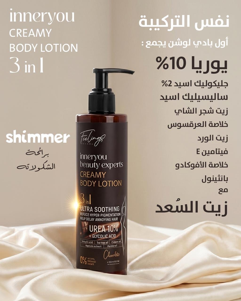 3️⃣ بادي لوشن بنفس التركيبة بالظبط عطر شيكولاته دافيء و كلاسيكي جذاب مع لمعة طبيعية و ناعمة تماما Shimmer effect