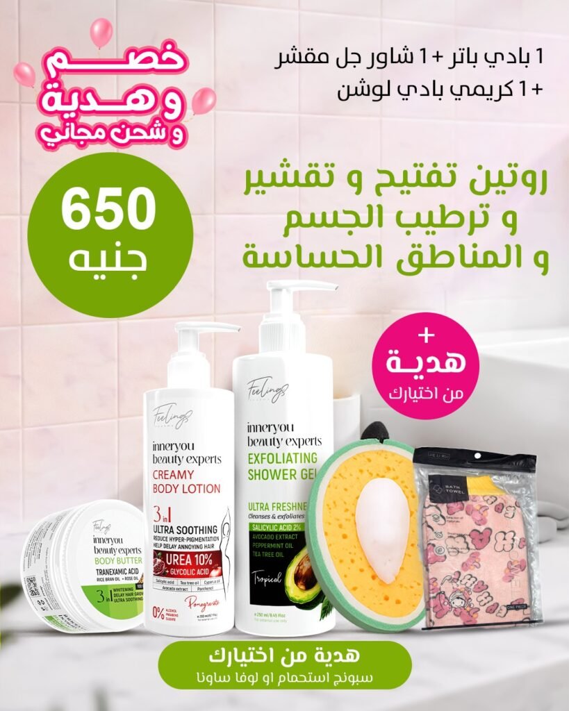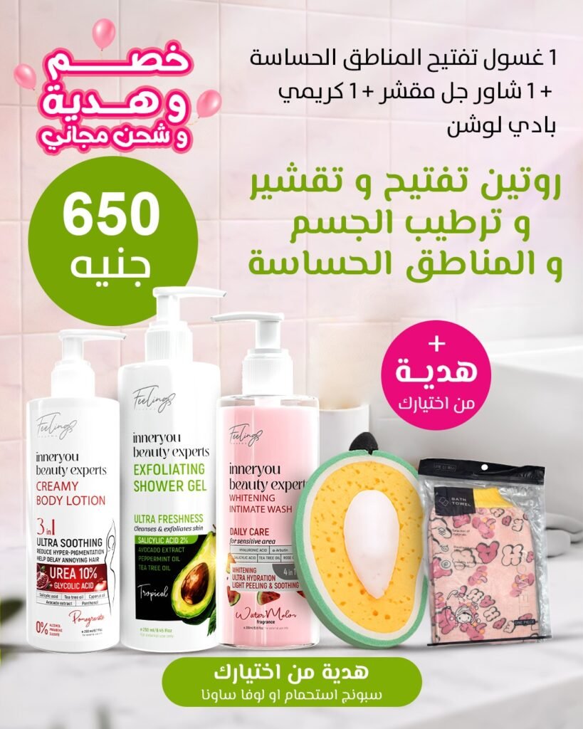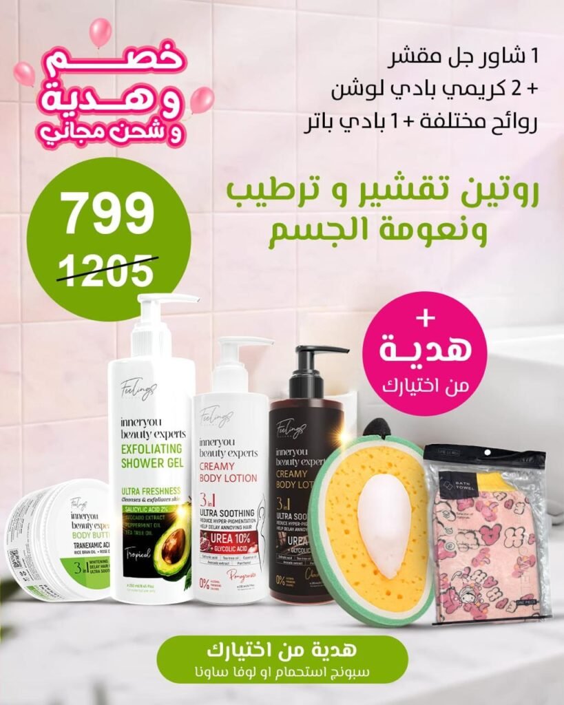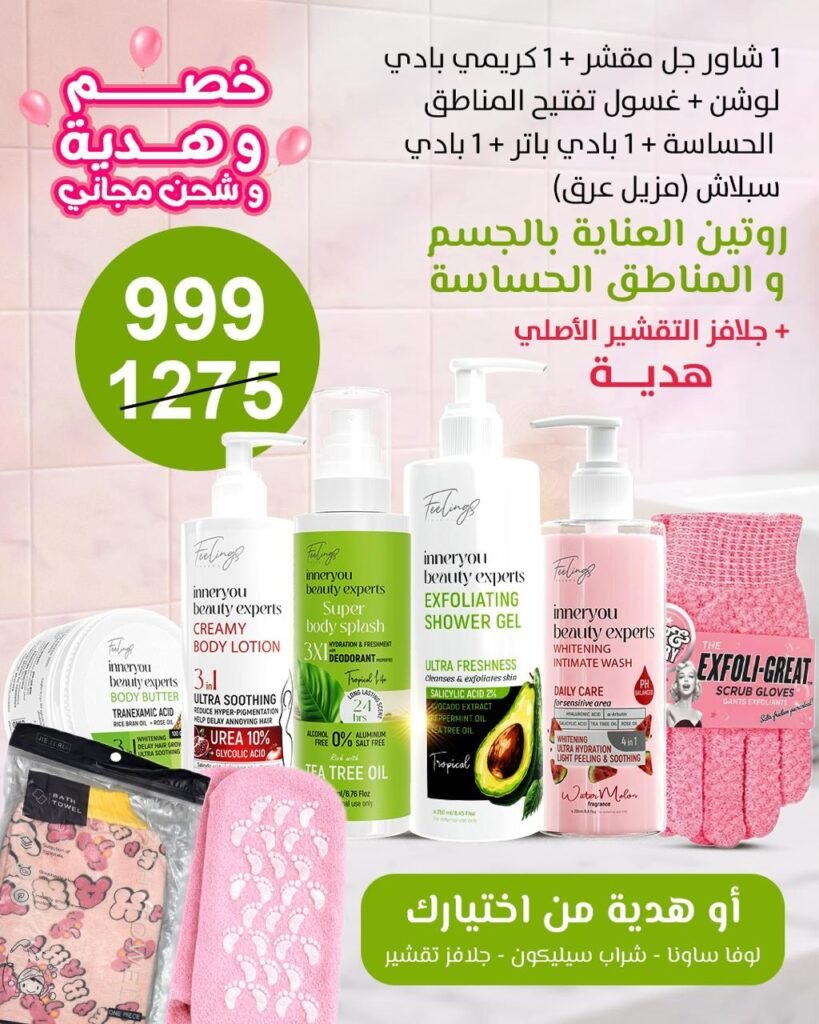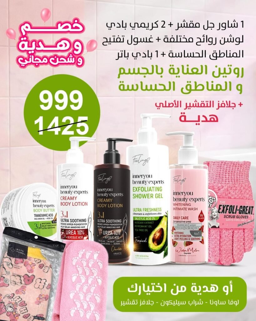 1 شاور جل مقشر + 1 كريمي بادي لوشن + غسول تفتيح المناطق الحساسة + 1 بادي باتر + 1 بادي سبلاش مزيل عرق)